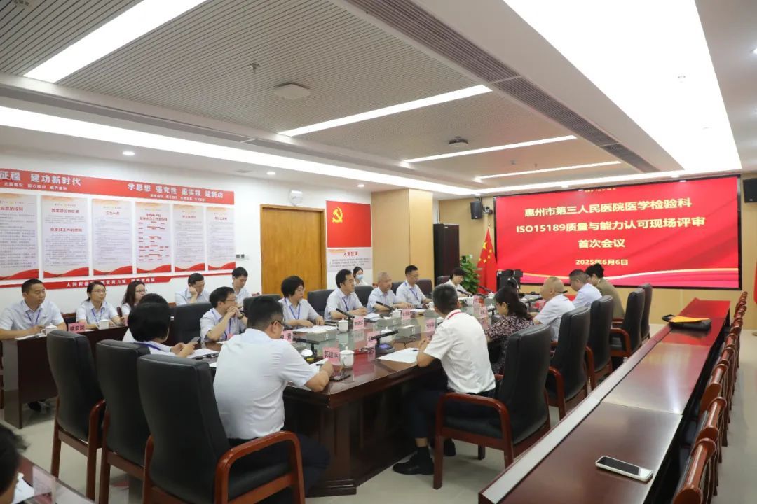现场评审首次会议于6月6日在惠州市第三人民医院心脑血管病大楼召开。惠州市第三人民医院医学检验部兼医学检验科主任黎村艳汇报了科室ISO15189质量管理体系的建设、运行和持续改进情况并展示取得的阶段性成果。